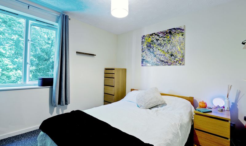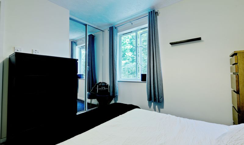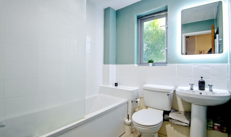 The bedroom is spacious and bright with mirrored built-in wardrobes and plenty of room for additional furniture. It benefits from a leafy outlook and provides a lovely space for unwinding. The bathroom has an appealing colour scheme and features white tiles and a white suite, including a full-length bath with shower over.