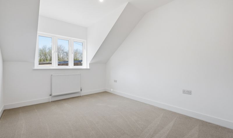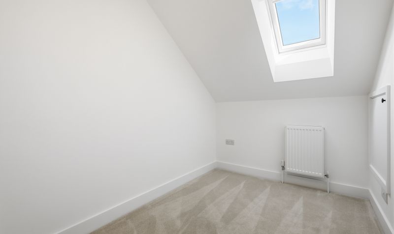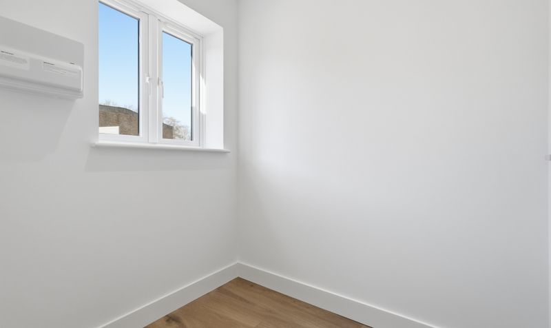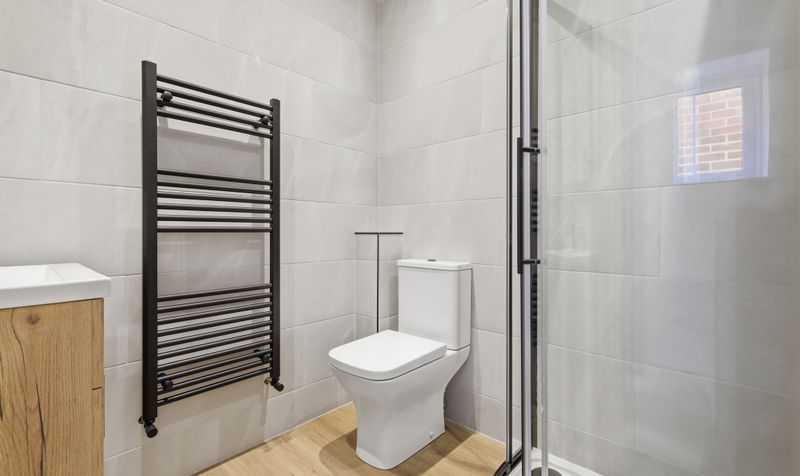 On the first floor is a well-proportioned and airy double bedroom decorated in a neutral colour palette. To the rear of the property is a generous, carpeted dressing room with a storage cupboard. It’s a versatile room which would also make a fantastic home office. The modern shower room is decorated in a clean and minimalist style with dove-grey wall tiles, wood-effect flooring and a contemporary white suite with black heated towel rail.