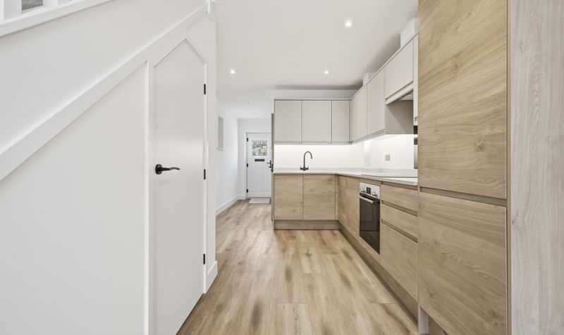 Entering the property, you immediately notice the high-quality finishes which are consistent throughout. The ground floor comprises of an open plan living space, with clean white walls and warm wooden flooring – a blank and welcoming canvas for you to introduce your own style. The kitchen/dining room features a sleek and modern kitchen, featuring a range of base units in a contemporary wooden finish with contrasting high gloss, neutral wall cabinets and coordinating slimline quartz work surfaces. Integrated appliances include an electric oven, induction hob, dishwasher and fridge-freezer. Layered LED lighting enables you to set the perfect ambience, and the breakfast bar provides the perfect spot to enjoy your first coffee of the day or perhaps an evening glass of wine. The dining area has space for a table and chairs to enjoy a relaxed meal together or for hosting friends. An understairs cupboard provides useful storage.