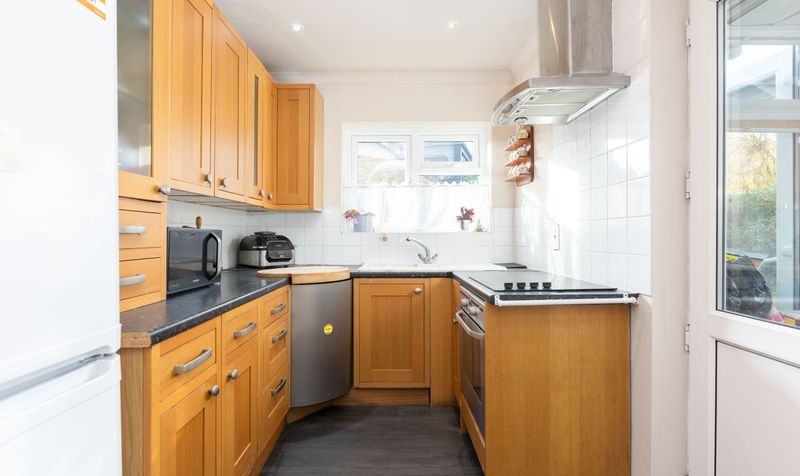 Open plan to the sitting room is a compact and modern kitchen. Featuring wooden shaker-style cabinetry with contrasting dark granite-effect worktops and flooring, the kitchen has ample storage space. The electric oven and induction hob are both integrated and there is space for a fridge-freezer. It’s a nicely designed space which has everything you need. A glazed door provides access to the garden via the conservatory – ideal for hosting barbecues during the summer months.