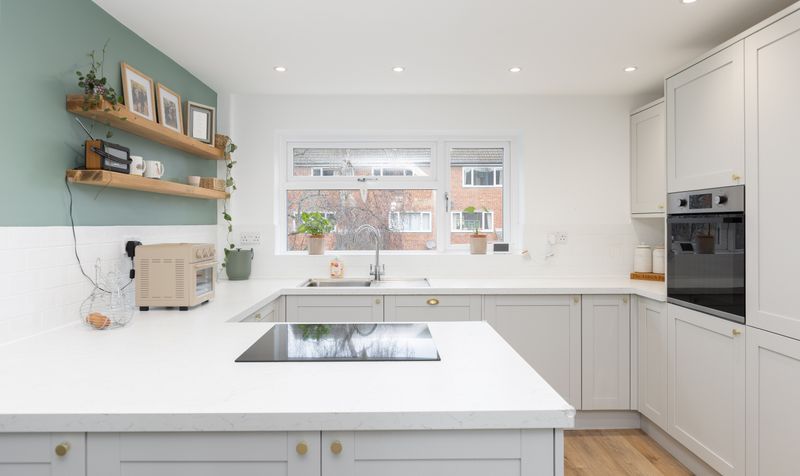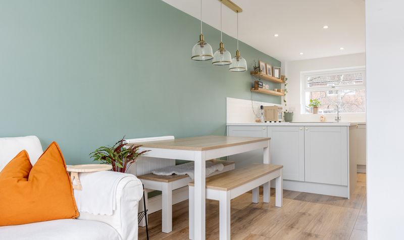 Located in the popular village of Ickleford, just a short walk from well-regarded local schools, is this well-presented and spacious maisonette. Benefiting from its own entrance, the property is located over two floors. As you enter and head upstairs to the living area, it feels warm and inviting with its sage-green feature walls and wooden flooring. A glazed door leads through from the landing to a contemporary kitchen which is open plan to the sitting/dining room. The kitchen is spacious with an appealing modern cottage feel. With plenty of natural light, as well as LED spotlights, it’s a lovely and bright space. The stylish dove-grey shaker-style cabinetry is complemented by white marbled worktops and brass accents to create a practical and appealing space with ample storage – the perfect setting for preparing meals.