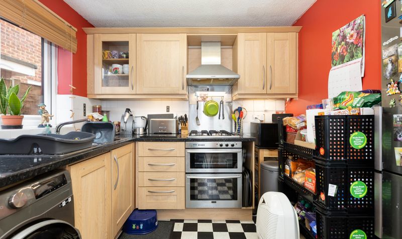 The spacious sitting/dining room enjoys plenty of natural light from a large window, with ample room for both a sofa and dining table, plus additional furniture. It’s a great space for relaxing after a busy day or catching up with friends. Glazed double doors lead through to the kitchen, which is neatly fitted with light wood cabinetry, white tiled splashbacks, warm red walls and chequerboard flooring. The kitchen features an integrated electric double oven and gas hob and there’s space for a washing machine and fridge-freezer.