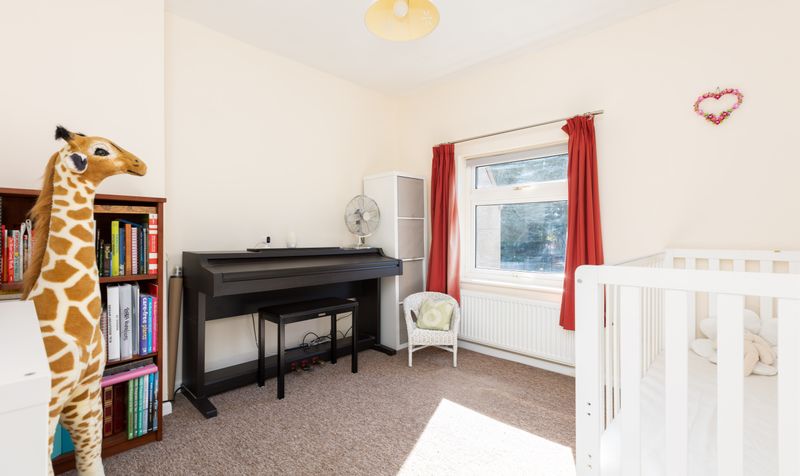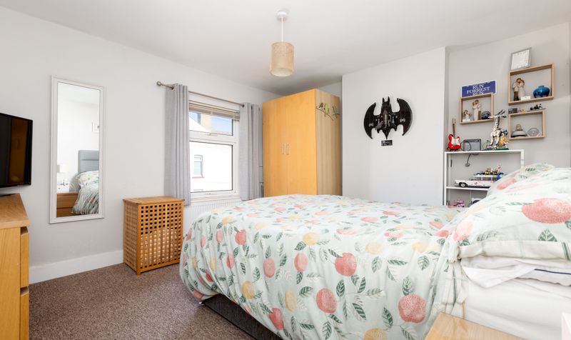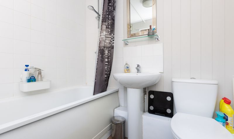 To the rear of the property, a practical lobby, with space for a washing machine in the cupboard, provides access to the garden and leads to the bathroom. The bathroom continues the modern theme with a white suite, including a full-length bath with shower over, complemented by white wall tiles and painted wood panelling. Upstairs are two well-proportioned double bedrooms – each a good size and light and airy, providing the perfect zone for relaxing.