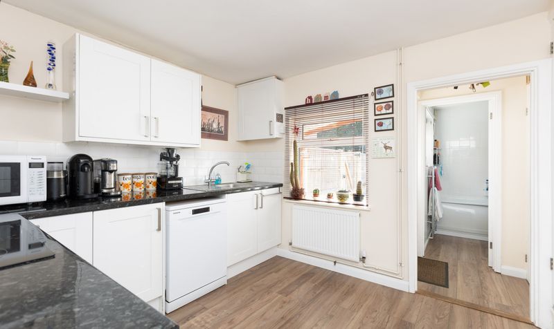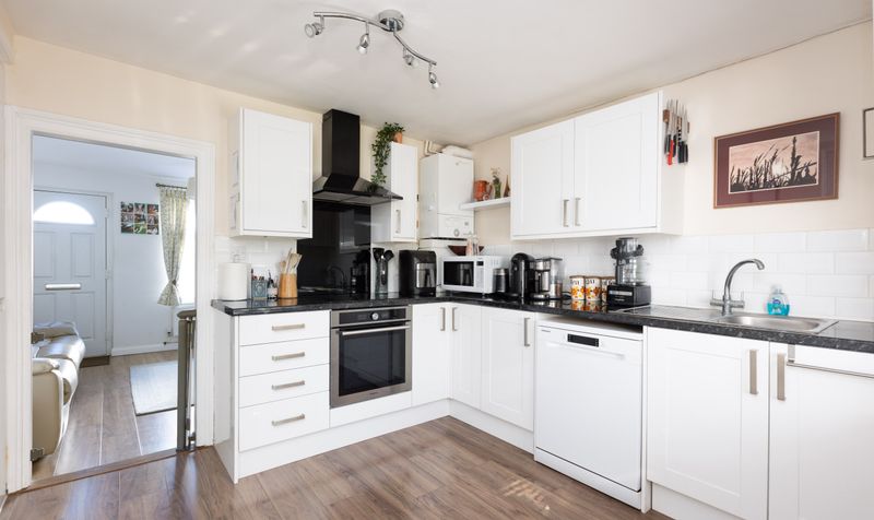The modern kitchen flows seamlessly from the sitting room and features white Shaker-style cabinetry with contrasting granite-effect worktops and white subway-tiled splashbacks. Integrated appliances include an electric oven and induction hob with a sleek black extractor hood, an integrated fridge freezer plus space for a dishwasher. Bright and well-planned, the kitchen offers plenty of storage and a perfect space for creating homecooked meals.