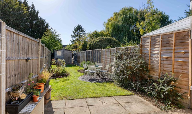 Outside, the property benefits from a long rear garden, mainly laid to lawn with paved and shingled areas – perfect for summer entertaining or for children to play. A large shed at the end of the garden offers excellent storage. To the front, there is a paved garden and two allocated parking spaces conveniently located beside the house.