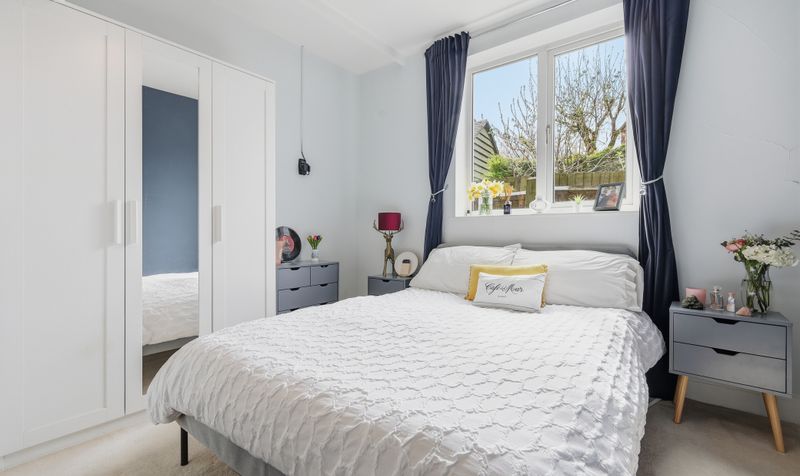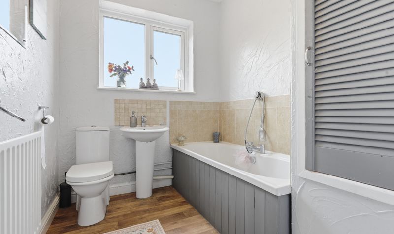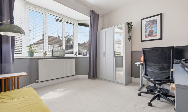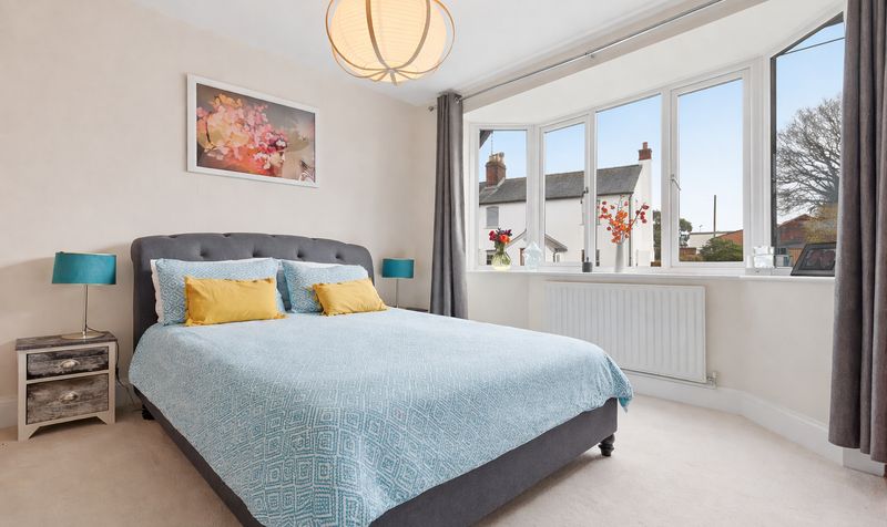 All three bedrooms are spacious, well-proportioned double rooms which feel light and airy. The two bedrooms at the front of the house benefit from neutral décor and large bay windows, and one also features custom-made wardrobes and an attractive fireplace. The third bedroom has a striking slate-grey feature wall.