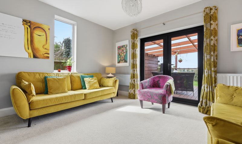 Entering the property, it immediately feels bright and welcoming, with all rooms leading off from the entrance hall. The generous sitting room enjoys a double-aspect and is a wonderfully bright space. Decorated in a pale dove grey shade with cream carpet, the room feels peaceful and is the perfect spot to sit back and relax after a busy day. A painted brickwork wall adds texture, and the fireplace and niches either side provide additional character. There is plenty of space to add a couple of comfy sofas and configure the room to suit your needs. Large patio doors offer access to the terrace and lovely views of the garden and the countryside beyond.