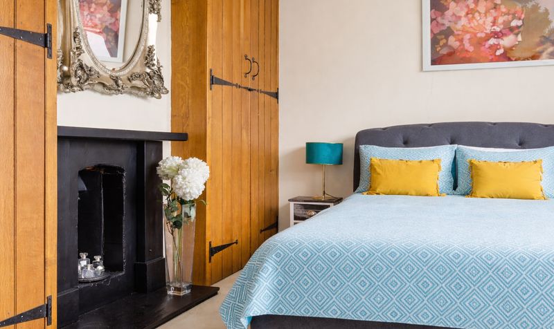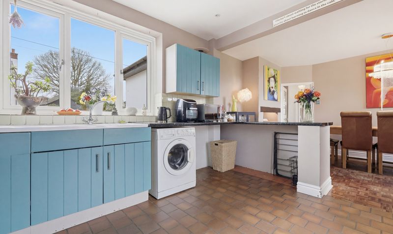The 22’ kitchen/dining room is another bright, dual-aspect room with plenty of natural light thanks to its large window and French doors which lead to the garden. The kitchen features rustic-style cabinetry in a striking blue with contrasting granite-effect work surfaces and cream tiled splashbacks, creating a country-cottage aesthetic. Integrated appliances include a double wall-mounted electric oven, induction hob with extractor fan, and there is space for a washing machine, dishwasher and American style fridge-freezer. The dining area features original parquet flooring, a picture window overlooking the garden and a feature log burner. With room for a large table and chairs, it’s perfect for enjoying meals with family and friends, and the French doors to the terrace provide a great set up for outdoor entertaining and alfresco dining during the summer months.
