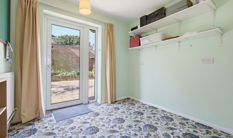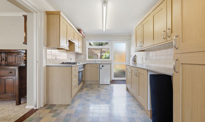 Leading on from the sitting room is a spacious kitchen/dining room which spans the rear of the property. This is another bright, dual-aspect room with plenty of natural light thanks to its large window and glazed door which leads to the garden. The kitchen features shaker-style cabinetry in a pale wood tone with complementary light worktops, white tiled splashbacks and neutral coloured flooring. Integrated appliances include a gas hob with extractor hood, electric oven and fridge-freezer, plus there is space for a dishwasher and washing machine. It’s a practical space for preparing meals whilst enjoying views over the garden. And, at over 25’ in length, the room has ample space to add a large dining table with chairs plus additional furniture – perfect for enjoying meals with family and friends. The door to the patio provides an ideal set up for alfresco dining outside during the summer months.