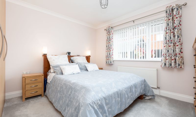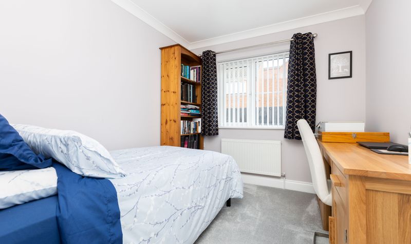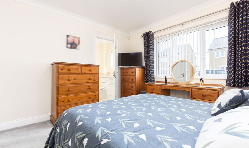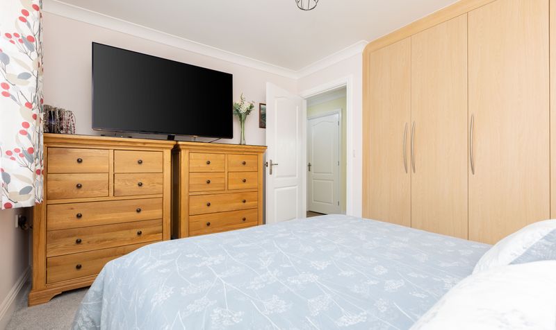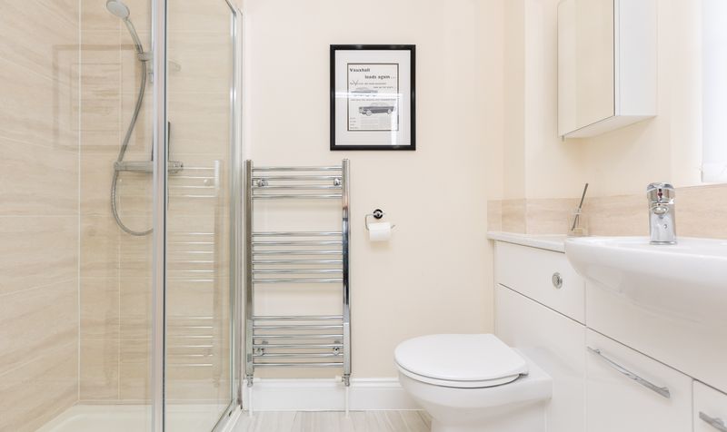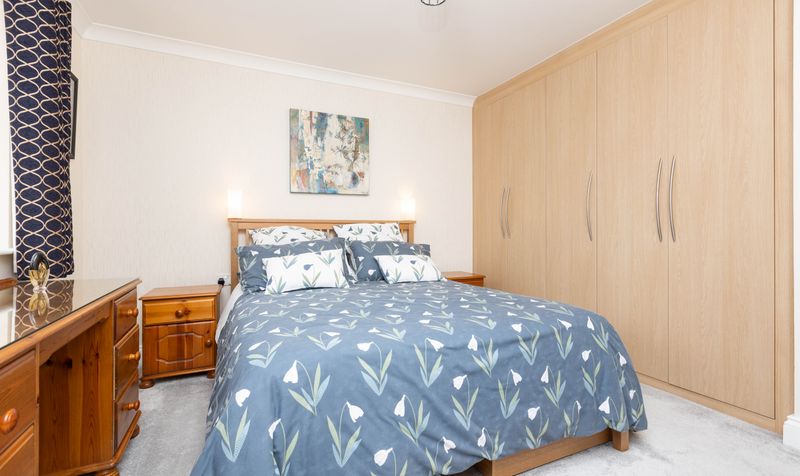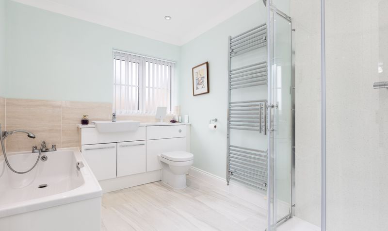 Also leading off from the hallway are three well-proportioned bedrooms. The principal bedroom features built-in wardrobes and its own ensuite shower room, with a contemporary white suite, large shower and heated chrome towel rail. The second bedroom is of similar dimensions and features built-in wardrobes and ample space for additional furniture. The third bedroom is a versatile, smaller double bedroom, which would also make an excellent home office or craft room. Completing the layout is a generous and bright family bathroom with a contemporary white suite, featuring a full-size bath, separate corner shower and heated chrome towel rail.