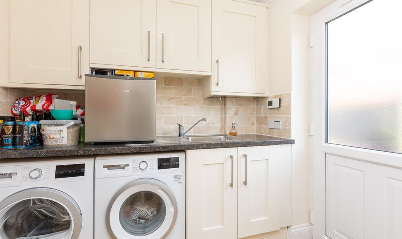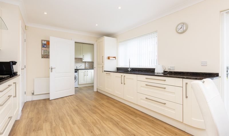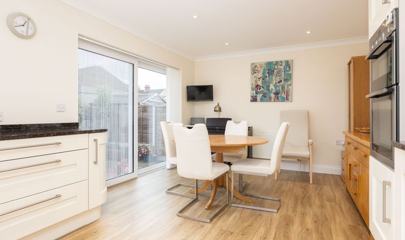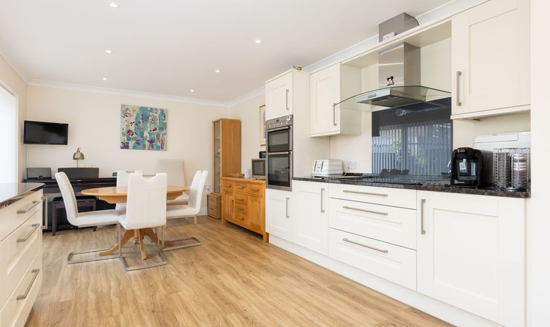 The generously sized kitchen/diner is the heart of this property, offering elegant and modern living. The kitchen features stylish shaker-style white cabinetry with contrasting granite worktops. All the kitchen appliances are integrated, including a double oven, induction hob with wall-mounted stainless steel and glass hood, fridge-freezer and dishwasher. Over 20 feet in length, the kitchen/diner has plenty of space for a table and chairs, as well as additional furniture. Large sliding doors lead out to the patio and garden, flooding the space with natural light and providing the perfect setting for indoor/outdoor living during the summer months. Whether you're relaxing with family or hosting guests, this room provides the perfect setting.