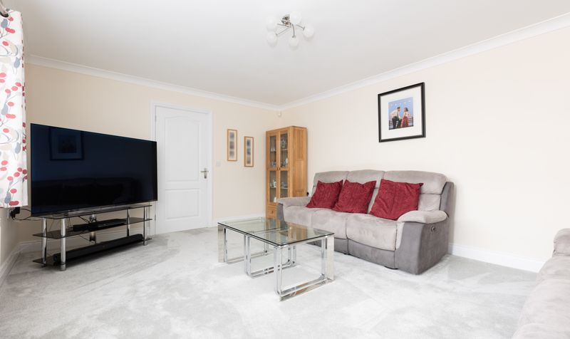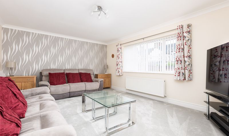 The sitting room is another spacious and inviting room leading off from the hallway. A large window introduces plenty of daylight and there is ample space for a couple of comfy sofas, alongside further furniture. The plush grey carpet is complemented by the striking feature wallpaper, and it provides the perfect spot to relax and put your feet up after a busy day.