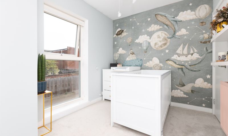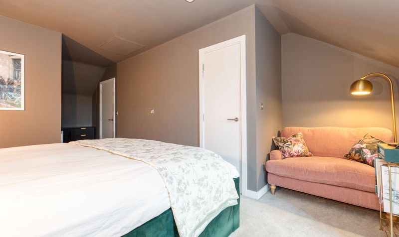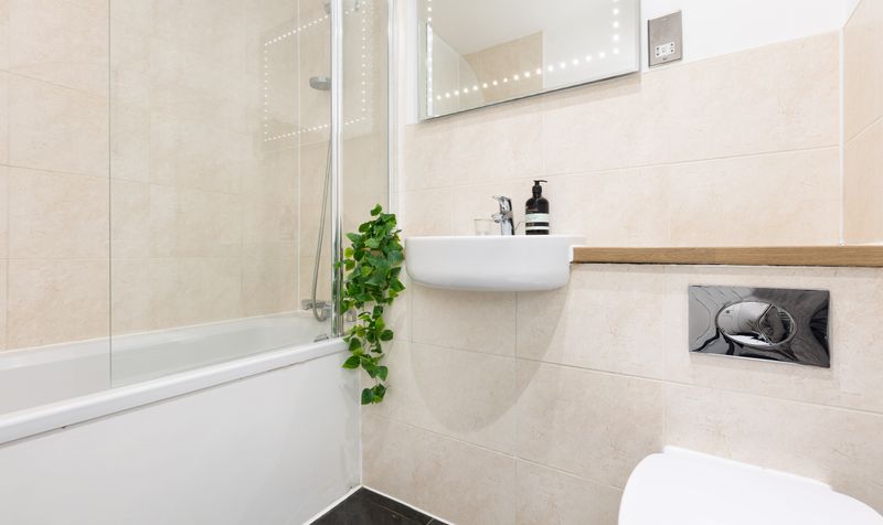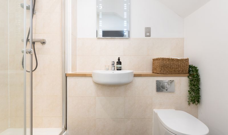 On the first floor are two well-proportioned double bedrooms, both with built-in wardrobes and full-height windows. A contemporary family bathroom, with a full-size bath and shower over, serves this floor. The second floor is dedicated to the main bedroom - a spacious and stylish room with built-in storage and a modern en-suite shower room.