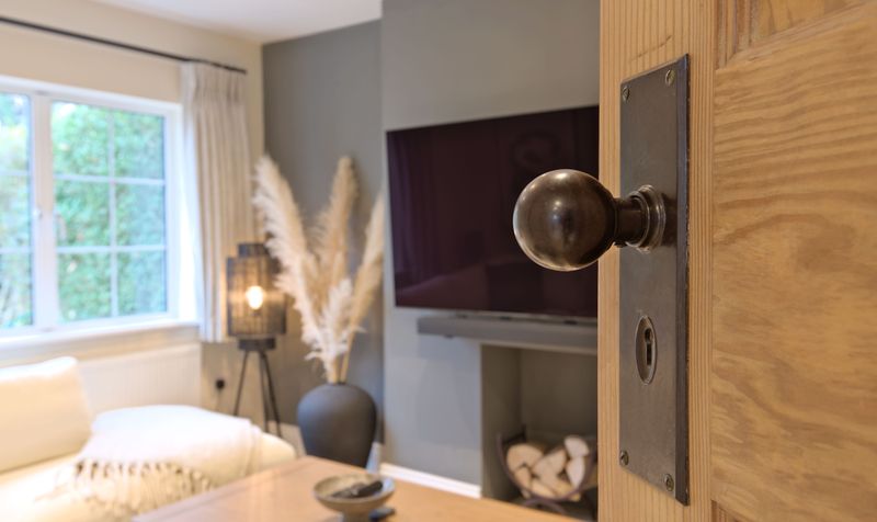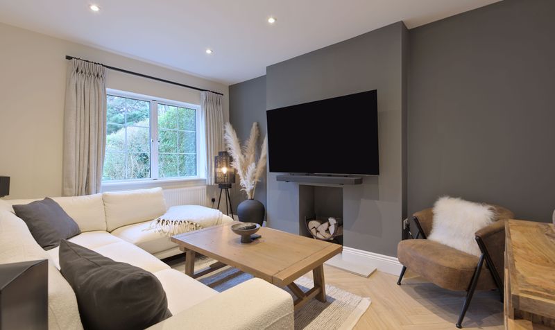 Stepping into the entrance hall, the house immediately strikes you as notably stylish with its calming, neutral décor, feature-wall panelling and light LVT herringbone flooring. To the left of the entrance hall is an elegant sitting room with an exposed brick feature fireplace and oak style mantel. Decorated in a warm, neutral colour palette with a neutral-toned carpet, LED spotlights and space for a couple of comfy sofas, it’s a welcoming and tranquil setting that’s perfect for enjoying cosy nights in with the family or entertaining friends.