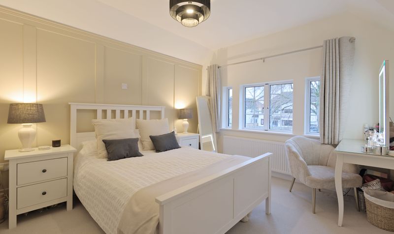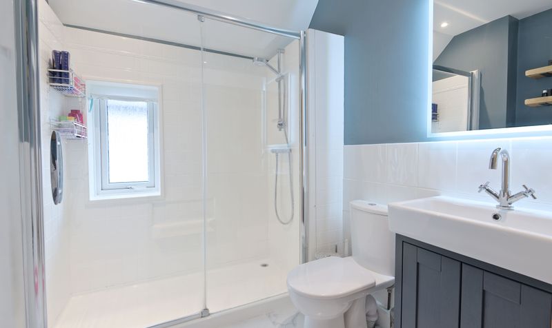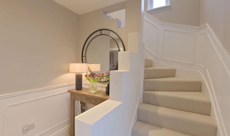 Upstairs, the warm neutral décor continues. All three bedrooms are airy and well-proportioned. The main bedroom is a beautifully relaxing room, decorated in light neutrals with feature wall-panelling and plenty of space for furniture – the perfect place to relax at the end of the day. The second bedroom is another spacious double which benefits from open-wardrobes and good natural light. The third bedroom is a generous single which would also make a great home office – perfect for working from home. The upstairs is completed by a modern shower room which features a contemporary white suite, including a large shower, sleek white tiling and a contrasting dark grey vanity unit.
