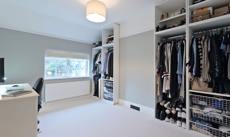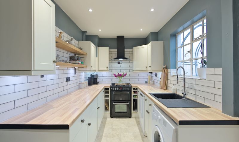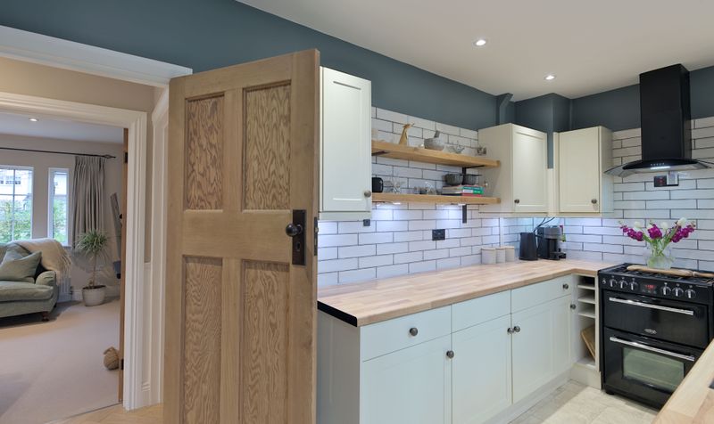The kitchen overlooks the garden and is contemporary in style. Featuring cream, shaker-style cabinetry with wood-effect worktops, white subway-tile splashbacks, contrasting dark-grey walls and neutral flooring, it feels classic but modern. The integrated equipment includes a sleek, black wall-mounted cooker hood and there is space for a cooker, washing machine and slimline dishwasher. Located next to the kitchen is a generous conservatory which is currently being used as a dining room. Bright and spacious, it leads directly out to the garden and is perfect for indoor-outdoor living during the summer months. Completing the downstairs is a large storage cupboard which is ideal for hiding away any clutter.