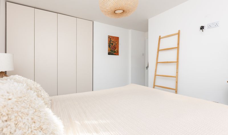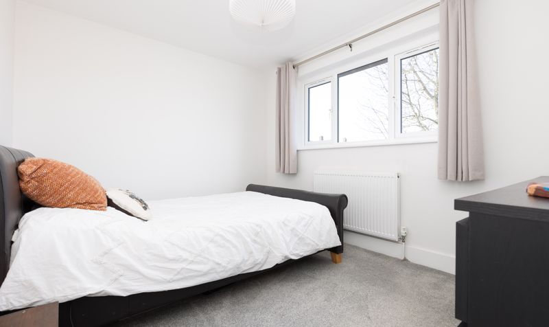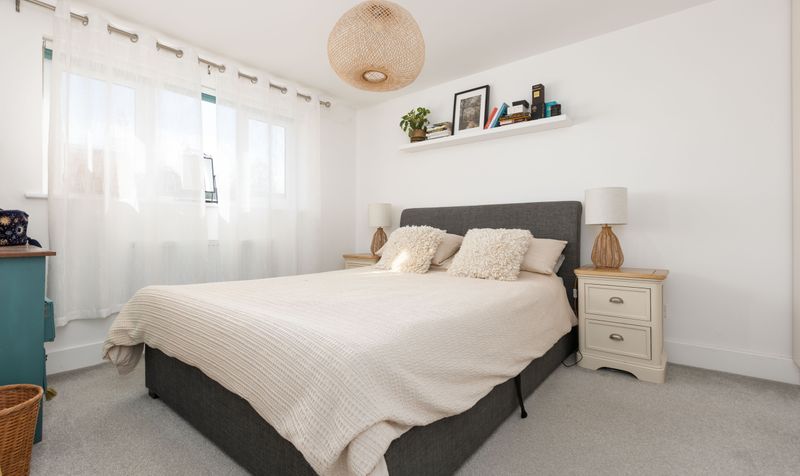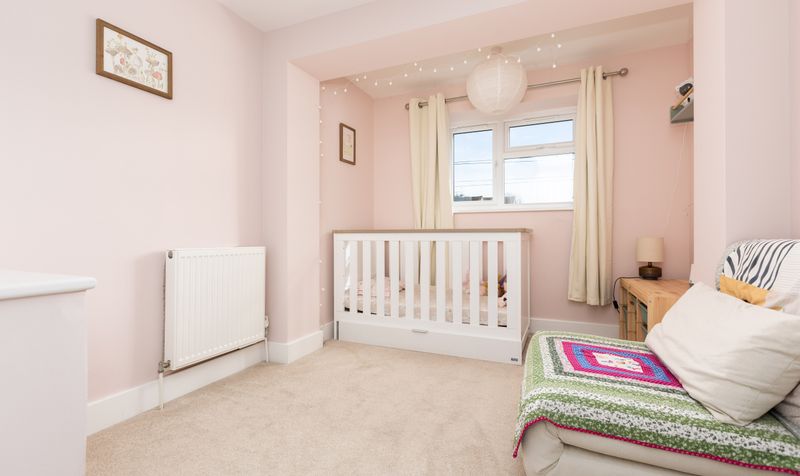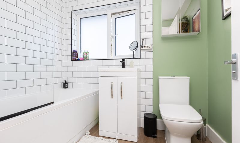 Upstairs are three well-proportioned and airy double bedrooms. Two of the bedrooms have a white décor scheme and the third bedroom – currently used as a nursery – has been painted a calming shade of pink. All rooms have a neutral carpet and a relaxing feel to them. The principal bedroom benefits from modern fitted wardrobes and the second bedroom also has built-in storage. The family bathroom is contemporary in style, featuring a modern white suite, including a full-size bath with shower over, a white vanity unit and white subway tiles. A green feature wall provides a striking contrast.