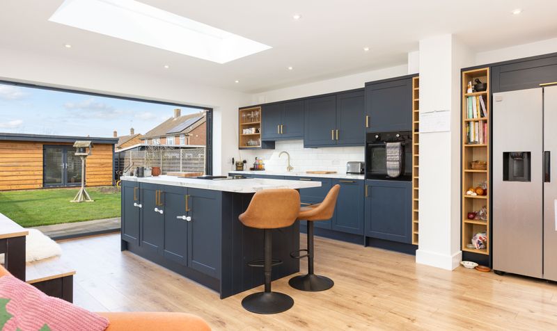 The stunning kitchen/dining/family room forms the heart of the house. Spanning an area of over 400 square feet, it’s a wonderfully bright and airy space thanks to its large skylight and bifold doors, providing the perfect setting whether you’re spending time with the family or entertaining friends. The kitchen is sleek and contemporary in design, featuring matt navy cabinetry with contrasting gold hardware, white marbled work surfaces and white subway tiles. Integrated appliances include a wall-mounted electric oven, induction hob and dishwasher, plus there is space for an American-style fridge-freezer. At the centre of the kitchen is a large island, where it’s easy to picture yourself enjoying that first freshly brewed coffee of the morning, or perhaps a glass of wine with friends in the evening.