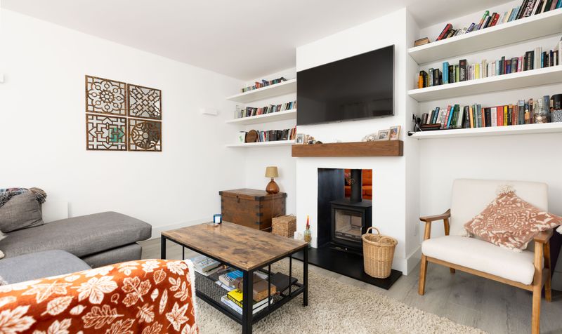 To your left is a bright and spacious sitting room. Filled with natural light thanks to its large window, the focal point of the room is a double-facing log burner cleverly positioned in a dual-sided fireplace – enabling you to enjoy the warmth in both the sitting room and family room simultaneously. There is plenty of space to add comfy sofas, making this the perfect space for relaxing after a busy day and cosying up in front of the fire on a chilly evening. The crisp white décor and neutral flooring also make this an easy space to accessorise to your own tastes.