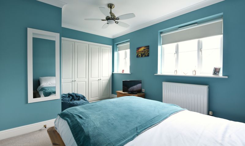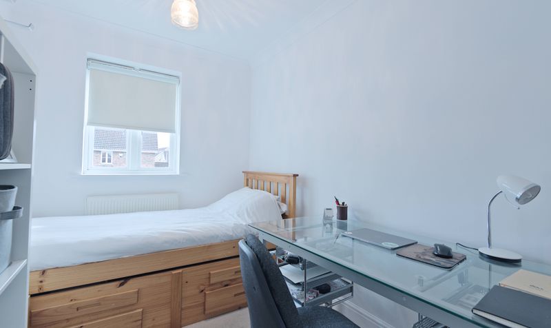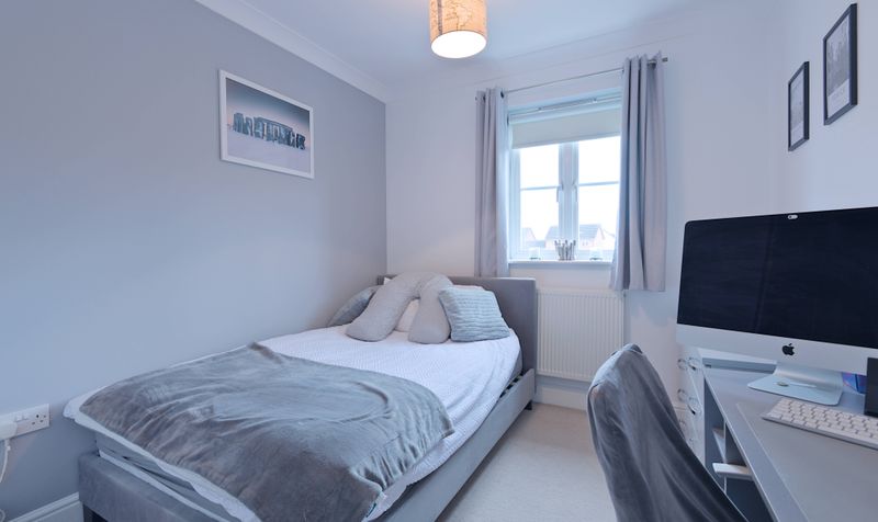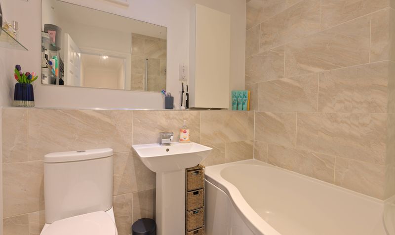 Heading up to the first floor, you’ll find three bedrooms – a spacious main bedroom and two smaller double bedrooms – all of decent proportions and attractively presented. The main bedroom spans the back of the house and has two windows overlooking the garden. Decorated in a calming shade of blue, it is a beautifully light and airy room with fitted wardrobes and plenty of space for furniture. The other two bedrooms are equally light and all the bedrooms have a neutral carpet. The family bathroom features marbled tiles in a natural tone and a modern white bathroom suite, including a full-size bath with shower over.