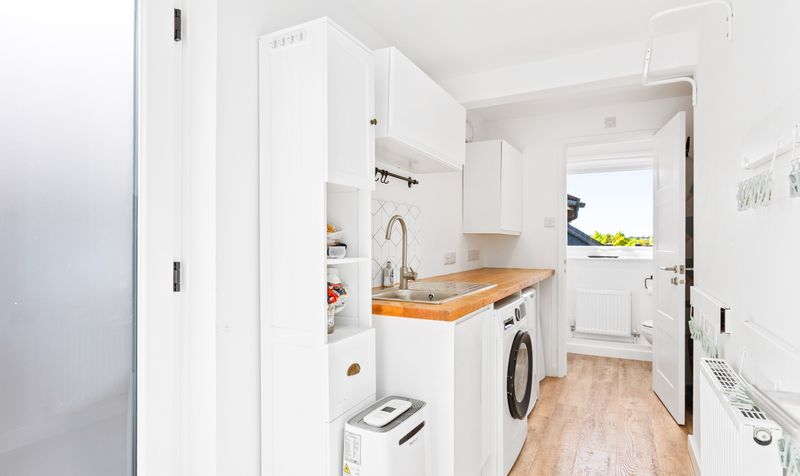 Continuing through into the family/dining room, this is a fantastic room for both spending time with loved ones and entertaining. With sliding glass doors spanning one wall and leading on to the large, decked area outside, there is plenty of room for a large dining table and chairs and it’s easy to picture hosting gatherings for friends and family. The black, vertical radiator and grey-green walls give the room a modern and sophisticated feel. Completing the downstairs is a practical utility room, which has been designed to complement the kitchen – a handy addition for any busy family.