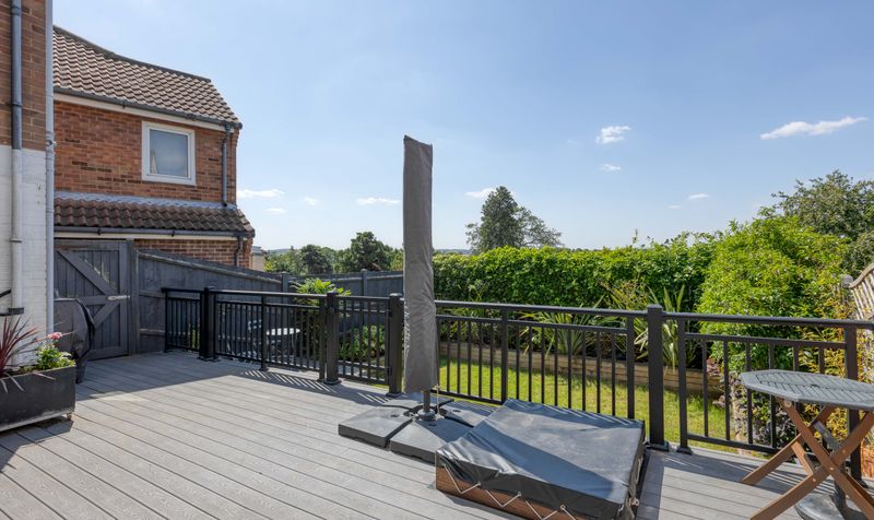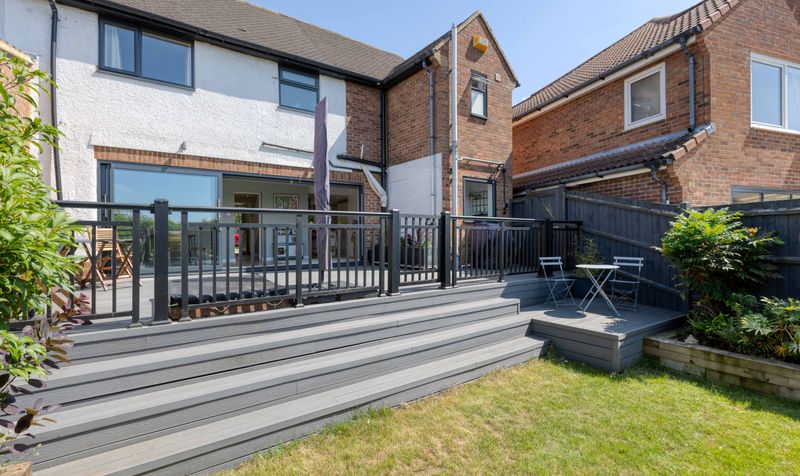 The back garden is low maintenance, featuring a secluded lawn with established borders (perfect for young children to play) and steps up to the enclosed decking area, which is ideal for hosting barbecues and enjoying the sunshine during the summer months. To the front of the property is a large driveway and a lawned area with established shrub borders.