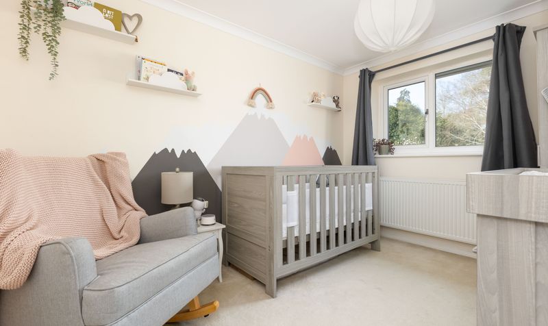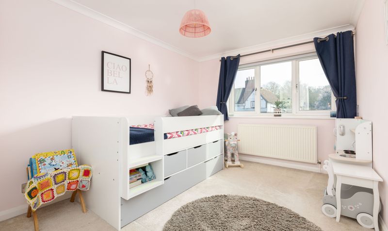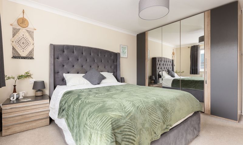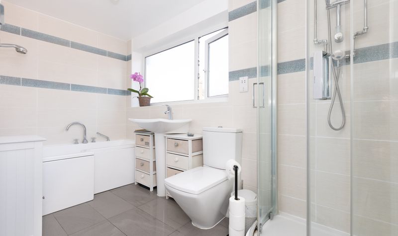 Upstairs are three well-proportioned double bedrooms. All three bedrooms feel spacious and airy and have large windows which introduce lots of natural light. The principal bedroom has built-in wardrobes and each bedroom has a calming décor and neutral carpet which create a lovely, relaxing space. The large family bathroom features a contemporary white suite, including a full-size bath with shower over, plus a separate shower cubicle. With dark grey floor tiles and neutral wall tiles, the room has a clean and modern feel.