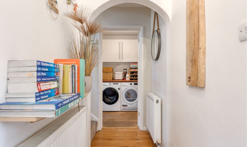 Completing the downstairs is a utility room, with space for a washing machine and tumble dryer which provides direct access to the garden, plus a modern cloakroom with a white suite.