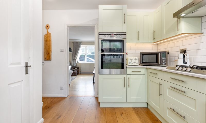 The kitchen is a modern and practical space, featuring oak flooring and Shaker-style cabinets in a fresh, on-trend pistachio green with contrasting marbled white work surfaces and white subway tile splashbacks. Integrated appliances include a Smeg gas hob with coordinating stainless-steel wall-mounted hood, an AEG double wall-mounted electric oven plus dishwasher, and space for a fridge-freezer. A walk-in pantry provides handy additional storage and, with views over the garden, it’s a lovely space for preparing family meals.