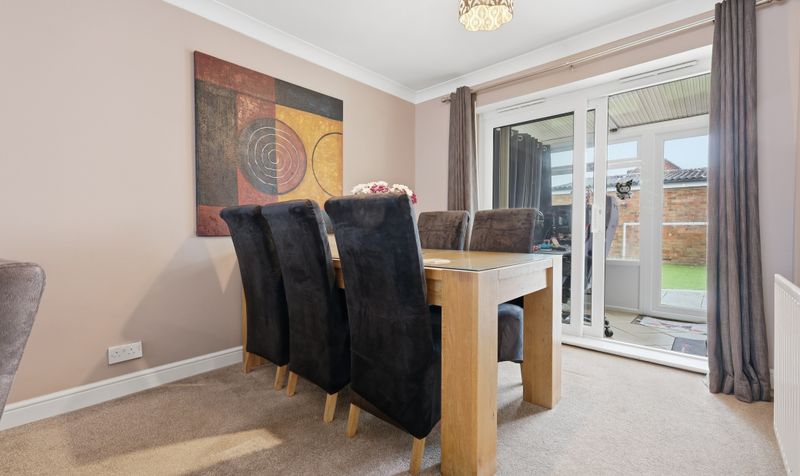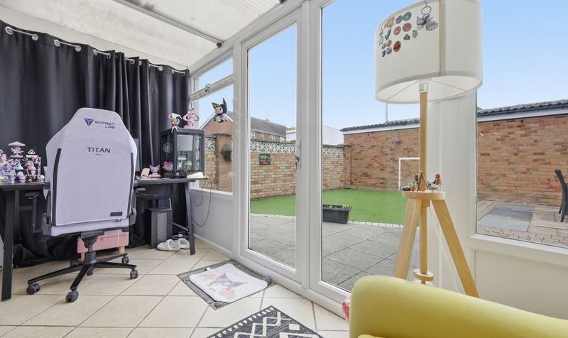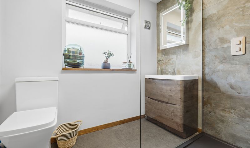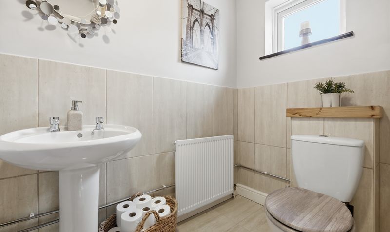 The generous 23’ sitting/dining room benefits from being dual aspect, with a large window to the front and conservatory at the opposite end. Decorated in dark neutrals, with a plush neutral carpet and feature fireplace with a modern wood surround, it’s a space that feels cosy and inviting. There is plenty of room to add a comfy sofa, plus a table and chairs, making it a versatile space that’s perfect for relaxing and spending time with family and friends. Double patio doors lead through to a bright conservatory. Currently used as a study, it is a flexible room that enjoys garden views and can be adapted to suit your needs. A contemporary cloakroom with wall tiles in a warm neutral tone and modern white sanitaryware completes the downstairs.