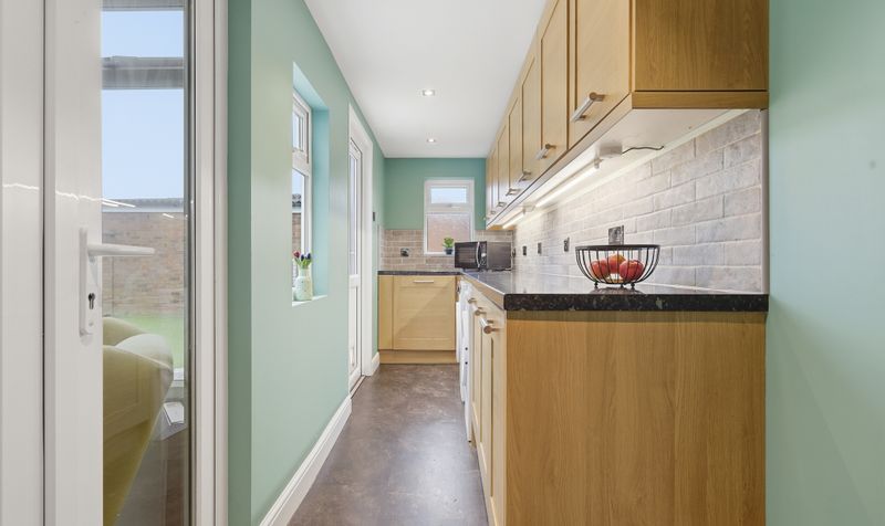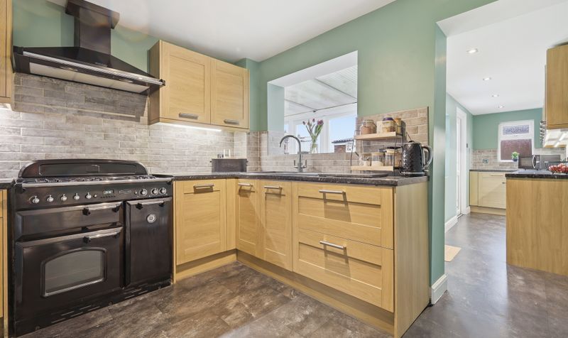 Entering via a covered porch and stepping into the spacious entrance hall, the property creates a good first impression. The entrance hall feels welcoming and is decorated in warm neutrals with a coordinating carpet. Progressing through to the kitchen, this is a bright and appealing space decorated in a fresh mint tone. Practical and modern, the kitchen features shaker-style cabinetry in a pale wood with contrasting granite-effect work surfaces and pale-grey stone subway tile splashbacks. Dark, stone-effect flooring completes the modern aesthetic. There is plenty of storage, and the kitchen features a large Rangemaster range with coordinating wall-mounted hood and space for a fridge-freezer. The kitchen continues through into a large utility area with plenty of cupboard space, plus room for a washing machine and tumble dryer. A part-glazed door provides access to the garden (handy if you are eating alfresco) and glazed French doors open on to the conservatory, introducing plenty of natural light.