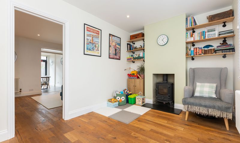 As you enter the cottage and step into the reception room, you’re greeted by a warm and welcoming ambience. Wooden flooring runs through into the sitting room, enhancing the sense of space and warmth. Calming tones of green and a fireplace with log burner further create a cosy and stylish atmosphere in this versatile room, which could have a number of uses including a playroom, snug or home office.