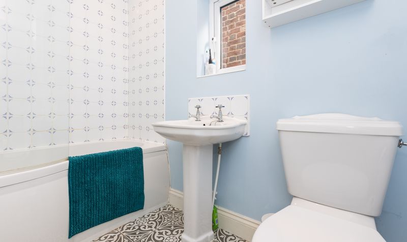 Upstairs are three, well-proportioned bedrooms – two double bedrooms and a generous single. Decorated in pretty pastel tones, each bedroom is light and airy with a neutral colour carpet. The double bedroom to the front of the house has retained lovely period features, including a fireplace and picture rail, and all three bedrooms provide a spacious and calm space for relaxing. The family bathroom features a white suite, including a full-size bath with shower over, and striking geometric floor tiles.
