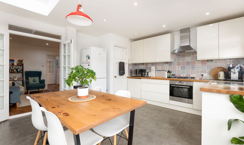 Glazed double doors lead through to a modern and stylish kitchen that has underfloor heating. Featuring sleek white cabinetry with wooden worktops, delightful Moroccan-influenced splashbacks and contrasting dark grey floor tiles, it’s a fantastic space which feels like the real heart of this home. A skylight and large French doors introduce plenty of natural light, as well as providing handy access to the patio – perfect for summer entertaining and seamless indoor-outdoor living. Integrated appliances include an electric oven with gas hob and wall-mounted stainless-steel hood, a dishwasher, a washing machine and there is space for a fridge-freezer. The dining area has ample space for a table and chairs, providing the perfect spot for enjoying meals with family and friends. Completing the downstairs is a handy modern cloakroom.