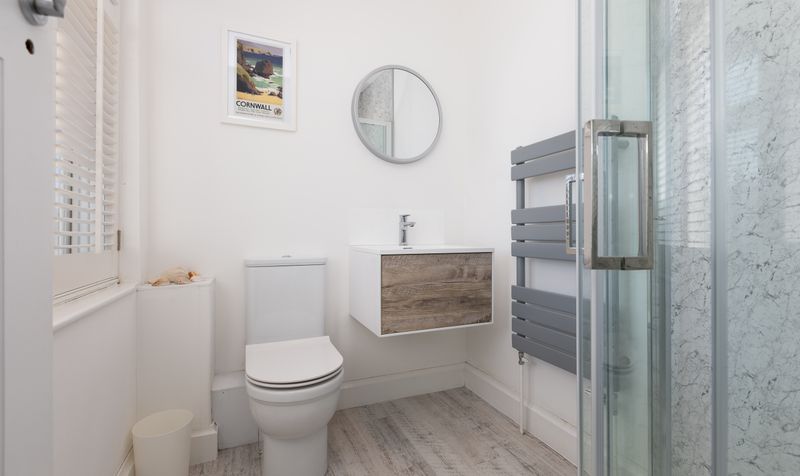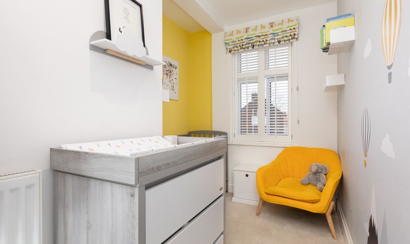 On the first floor are three bedrooms, all well-presented and with neutral carpets. The smallest bedroom is currently being used as a nursery, and the other two bedrooms are well-proportioned and spacious doubles with feature fireplaces. All the bedrooms have large windows which introduce plenty of natural light and are finished with modern shutters. One of the double rooms benefits from its own ensuite shower room, decorated in fresh white tones and featuring a modern white suite with distressed-wood effect flooring and a grey heated towel radiator.