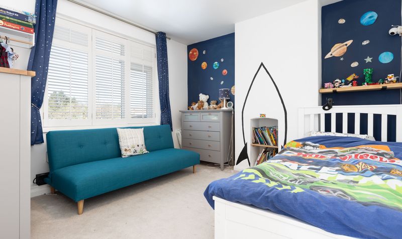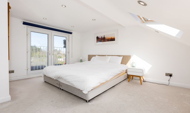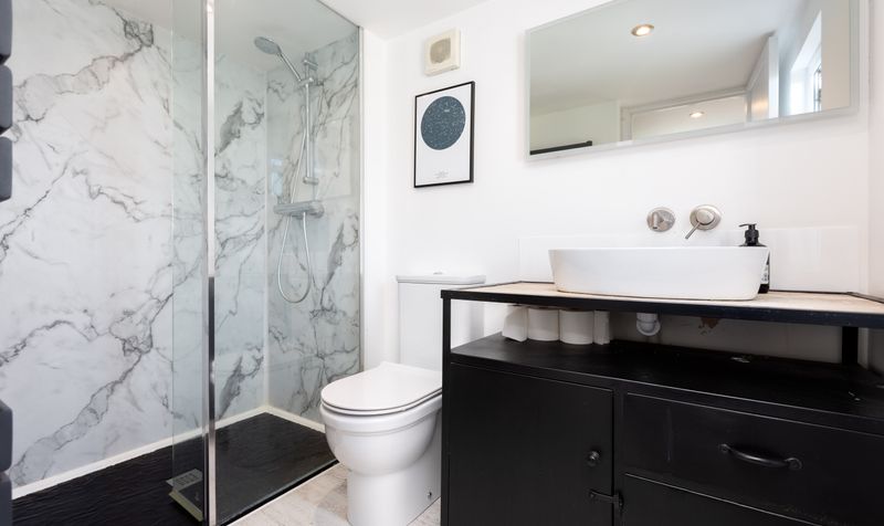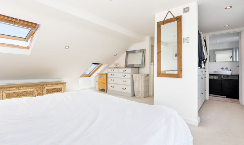 A loft extension on the second floor has created a superb principal bedroom suite. Extremely airy and spacious, this floor has a fresh white scheme with a plush neutral carpet and plenty of room for furniture. The bedroom enjoys French doors with a Juliet balcony overlooking the garden, as well as its own dressing area. The ensuite shower room has been tastefully designed in a monochrome palette with black vanity unit, contemporary white sanitaryware and a walk-in shower with stunning marbled tiles. The whole suite provides a relaxing sanctuary to escape to after a busy day.