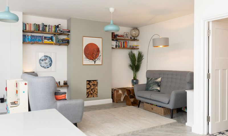 The open layout flows effortlessly into the dining area which has ample space for a large table and chairs and is perfect for both enjoying both relaxed family meals and entertaining. The large skylight overhead and bifold doors flood the area with natural light and provide attractive garden views. It’s a fantastic set up for hosting barbecues during the summer months and enjoying indoor-outdoor living. The family room is a comfortable space for spending time together. A chimney breast decorated in a warm grey with feature nook provides interest and there is room for adding a couple of sofas plus additional furniture. The generous, open plan living space is perfect for modern family living and entertaining.