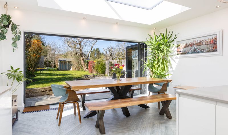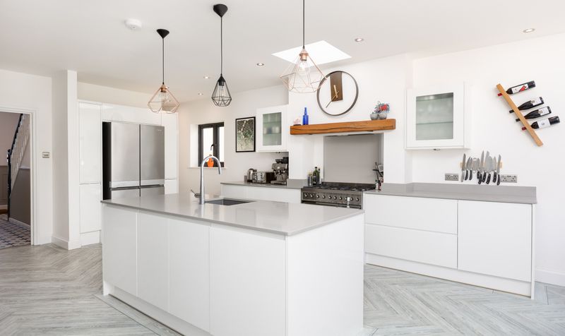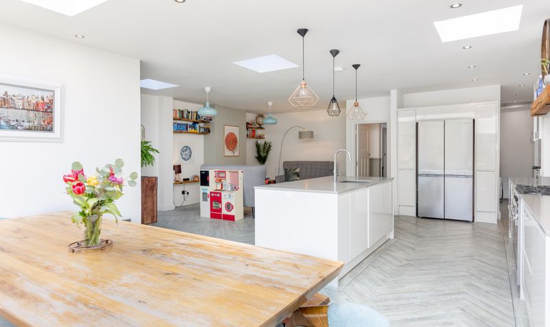 At the end of the hallway, the home opens up into a generous, open plan living space, seamlessly combining the kitchen, dining and family areas. This beautifully presented space has a contemporary aesthetic and forms the heart of the home. Large bifold doors and multiple skylights fill the whole area with natural light, making it feel open and airy, and attractive herringbone LVT flooring in a light wood tone runs throughout the space. The dual-aspect and modern kitchen features sleek, white high-gloss cabinetry with dove-grey slimline quartz work surfaces and an impressive kitchen island. The kitchen includes plenty of storage and has an integrated dishwasher, plus space for a range cooker and American-style fridge-freezer. It’s a wonderful space for those who enjoy cooking and entertaining. Tucked around the back of the kitchen is the practical addition of a utility area with access to the garden.