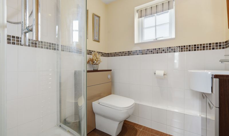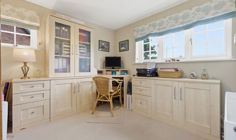 The downstairs shower room features a brown and white colour scheme with a modern suite including a shower cubicle and white sanitaryware. The spacious dual-aspect office is the perfect spot for working from home and enjoys views to the front and back of the property.