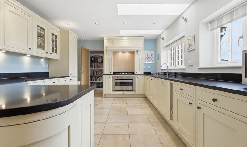 The bespoke kitchen is the real heart of the home and has a lovely, modern country-kitchen feel. Over 23’ in length, it feels extremely spacious and features cream, shaker-style cabinetry with contrasting black work surfaces and neutral floor tiles. There is plenty of storage space and the skylights and multiple windows help make it a light room. Integrated appliances include an impressive stainless steel electric oven with gas hob, a dishwasher and fridge-freezer.
