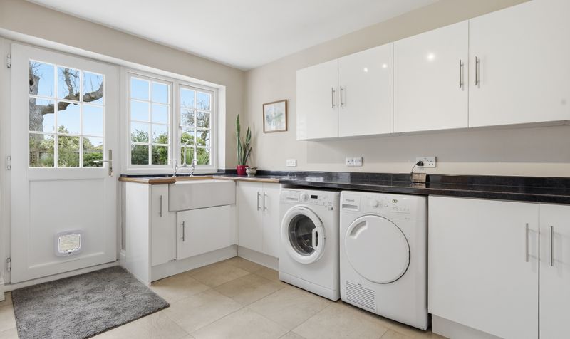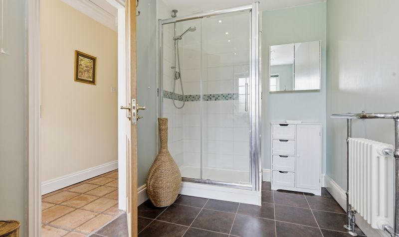 To the rear of the property is a sizeable utility with access to both the garden and garage. Designed in a country style and featuring a range of white cabinetry with a traditional butlers sink, it has space for a washing machine and tumble dryer and is an indispensable addition for any busy household (particularly if you are returning home with muddy dogs and/or children!) Adjacent to the utility is a modern shower room. Another practical addition, it features a modern white suite with a large shower, soft green walls and coordinating mosaic tilework. A traditional radiator provides a stylish juxtaposition and nod to the property’s history.