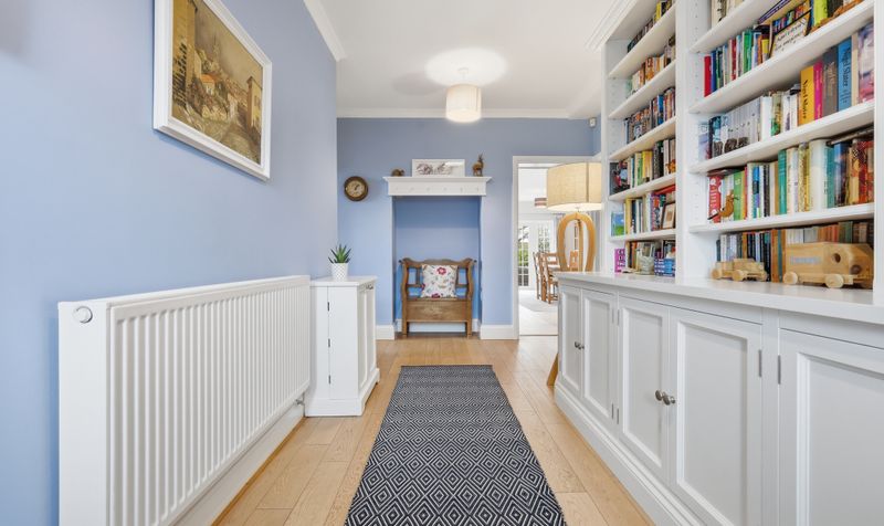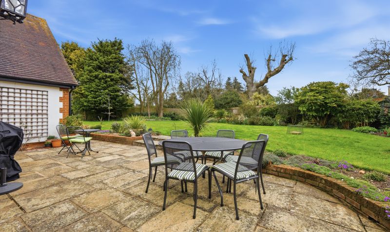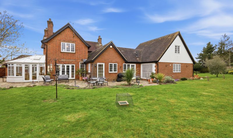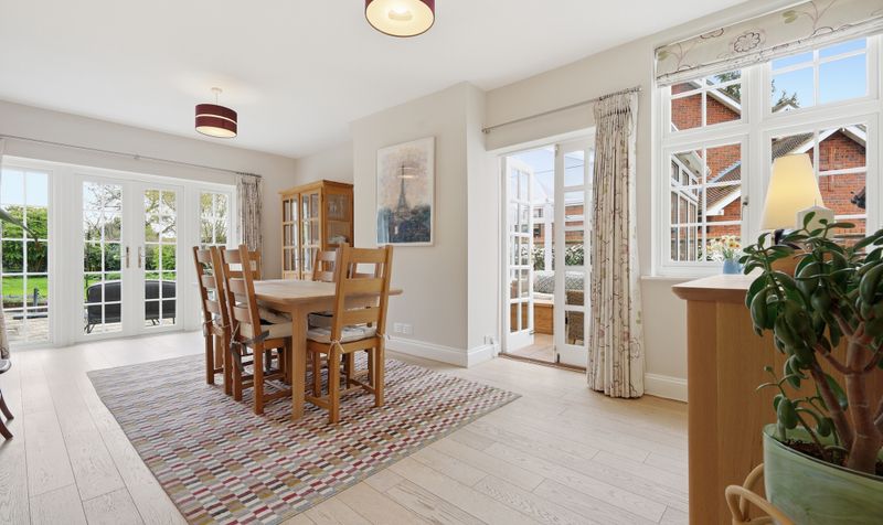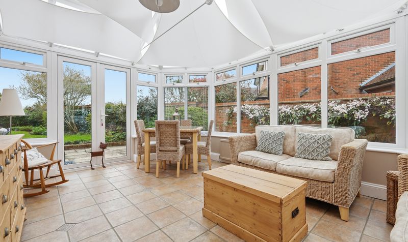 A lobby leads through to a generous and elegant dining room, which can also be accessed via the entrance hall. The dining room is a tasteful setting for both relaxed family meals and entertaining friends. A beautifully bright room thanks to its two sets of French doors, it has plenty of space for a large dining table and chairs alongside other furniture, and benefits from a soft neutral colour palette and warm oak flooring. With French doors leading out to the patio, it also provides the perfect set up for alfresco entertaining and indoor-outdoor living during the summer months. A second set of French doors maximises the natural light and leads through to a large conservatory. Currently set up as an entertaining area - with sofas and a dining table and chairs – this is a versatile space with practical sun blinds and beautiful garden views, which comes into its own during the summer.