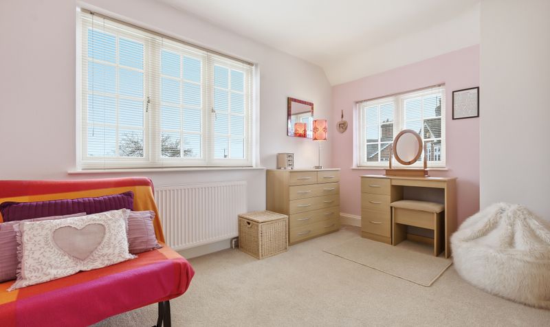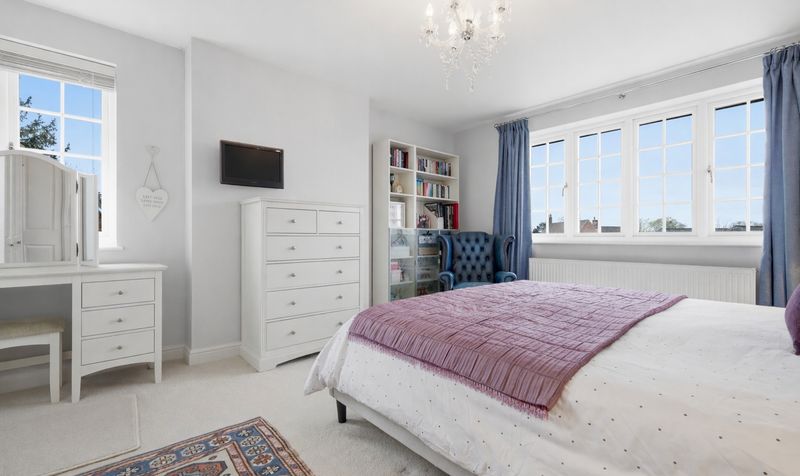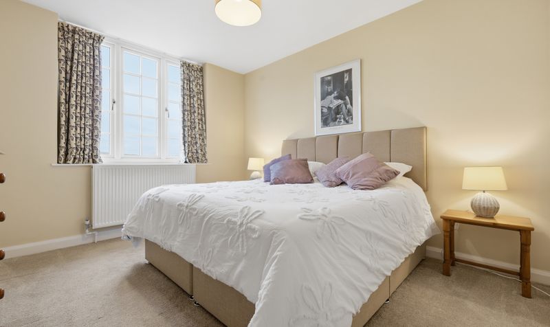 On the first floor are four spacious double bedrooms – all of similar, generous proportions (so no disagreements over who gets which room!) Each bedroom is decorated in a relaxing colour palette and three of the rooms are double-aspect, making them feel wonderfully light and airy. One of the bedrooms has an attractive feature wall with dove-grey wall-panelling behind the bed.