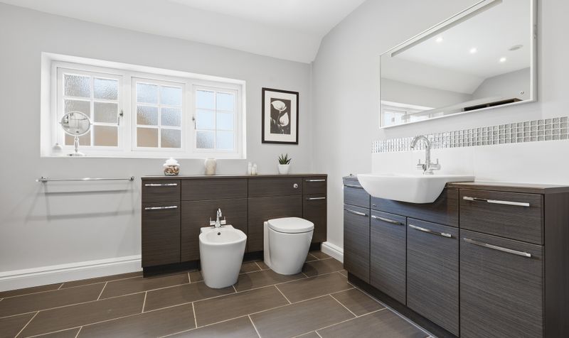 The large family bathroom is contemporary in style and features modern vanity units - which offer plenty of storage – and a modern white bathroom suite, including a bidet and full-size bath with shower over. The coordinating floor and wall tiles help create a stylish and modern feel.