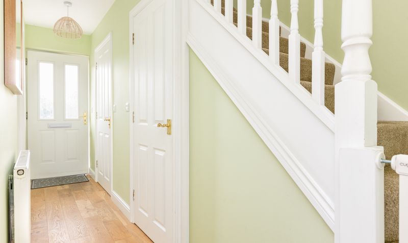 Stepping inside this well-presented family home, it immediately feels welcoming. The entrance hall has wooden flooring and olive-green walls which create a warm environment, and there’s a large storage cupboard which is perfect for stashing away coats and shoes.