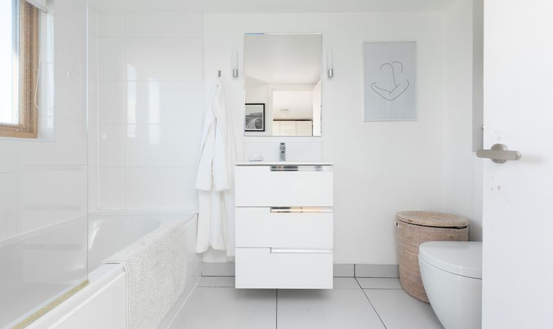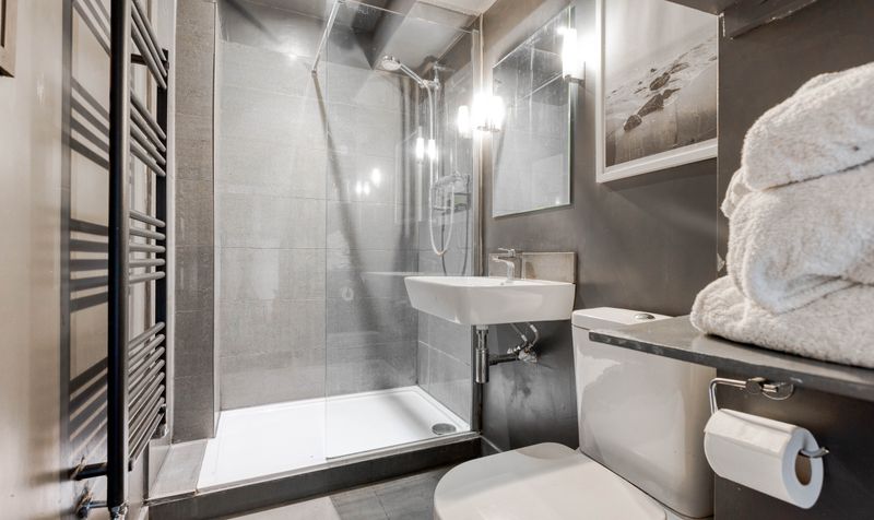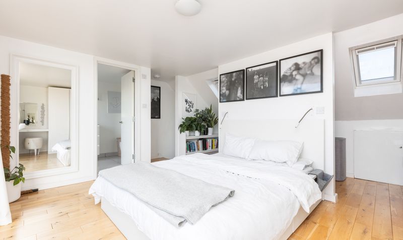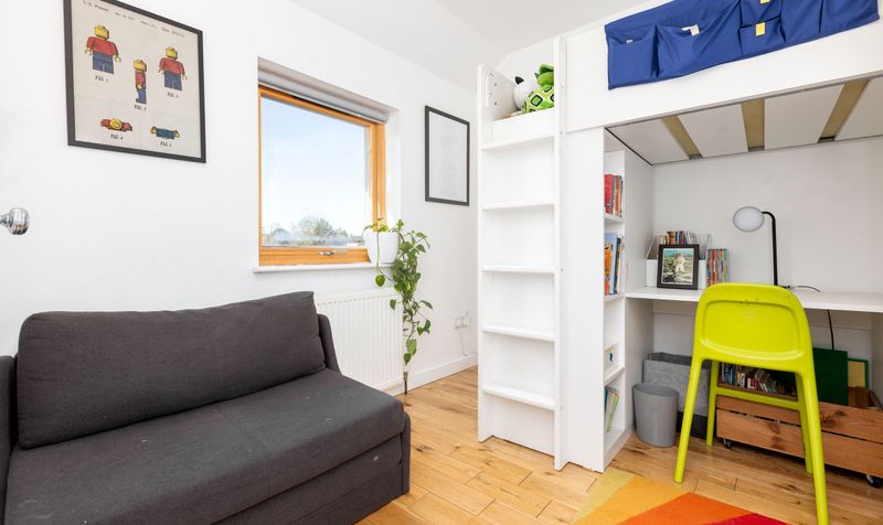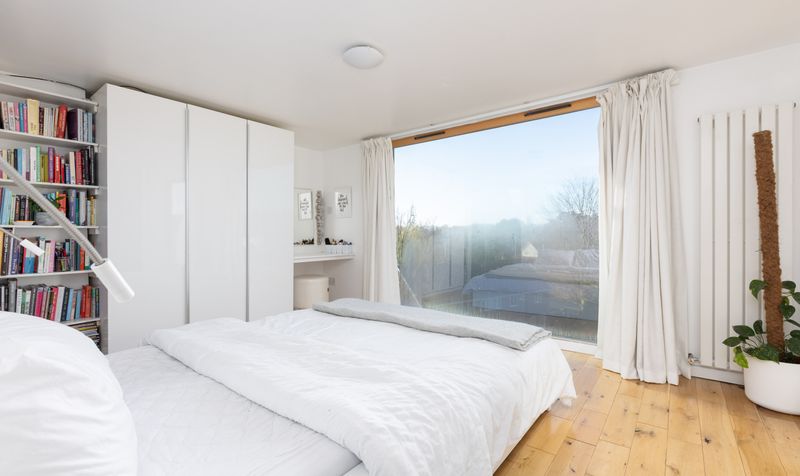 Heading upstairs, on the first floor are three bedrooms, all with wooden flooring and a neutral colour scheme. One bedroom has a built-in wardrobe, and all feel bright and airy. The family bathroom is also on this floor - contemporary in style, it features dark grey walls, grey tiling and a walk-in shower with modern white suite, plus black heated towel rail. A further staircase takes you to the second floor and the spacious principal bedroom suite. Complete with dressing area and a large ensuite bathroom, the focal point of this modern bedroom is the floor-to-ceiling picture window with views out to the garden and beyond. The stylish ensuite has a fresh white scheme, featuring a full-size bath with shower over and wall-mounted vanity unit. The whole floor provides a welcome sanctuary to relax in, tucked away from the rest of the house.