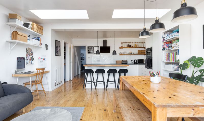 The dining/family room is a bright space with two large skylights and bifold doors introducing plenty of natural light. There’s space for a large table and chairs as well as a sofa or two, making this the ideal space for entertaining, particularly if you enjoy hosting summer barbecues, as there’s direct access to the patio outside.