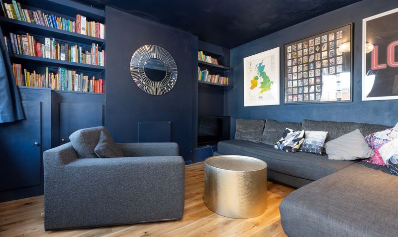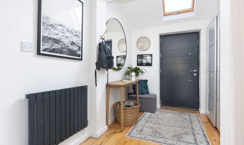 Stepping into the spacious hallway, the first impression is of a welcoming family home. Wooden flooring runs throughout the downstairs, creating a sense of warmth and space. To your left is a comfortable and contemporary sitting room, colour drenched in navy to create an atmospheric setting for spending time with family and friends. Built-in cabinetry and shelving provide useful storage either side of the chimney breast and, with plenty of room for a couple of comfy sofas, it’s the perfect place to enjoy cosy evenings in.