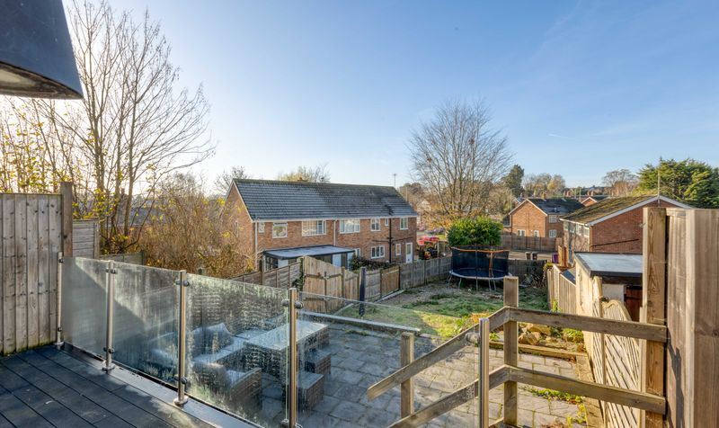The terraced south-west facing garden features a raised decking area next to the house with a glass balustrade which leads down to a large patio with plenty of room for furniture – a fantastic spot for entertaining or simply enjoying the sunshine. The lawned area beyond provides the perfect spot for children to play. The rear garden measures 93’ x 54’ (at its maximum width). To the front of the property is a low-maintenance gravelled driveway with off-street parking.