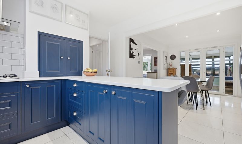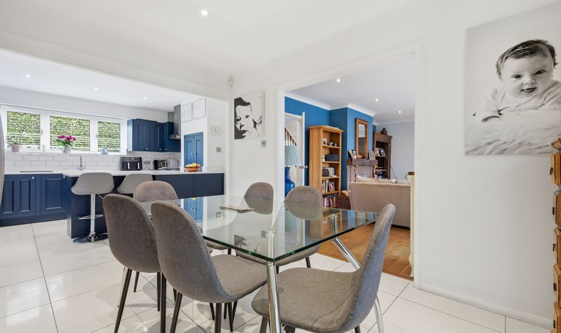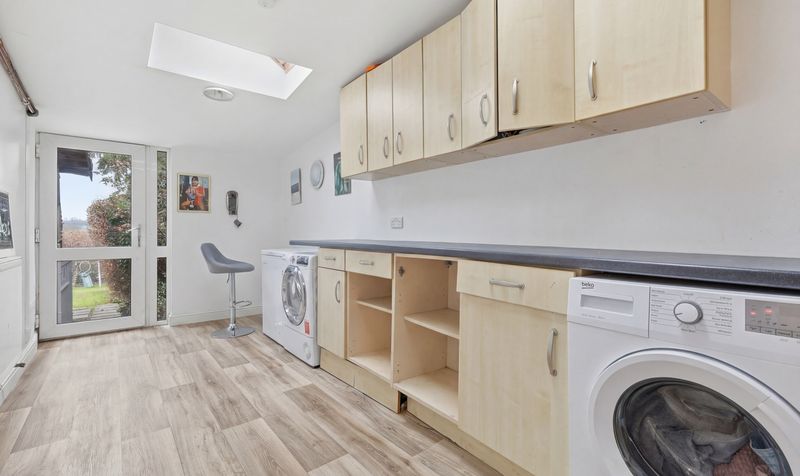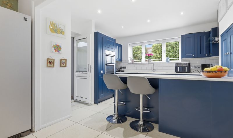 Leading off from the entrance hall is the open plan kitchen/dining room. The kitchen is stylish and modern, featuring navy Shaker-style cabinetry with contrasting subway tile splashbacks, quartz worktops and floor tiles, all in crisp white. Integrated appliances include a gas hob with stainless steel wall-mounted hood, dishwasher and wall-mounted double electric ovens, and there is space for a fridge-freezer and dishwasher. The breakfast bar provides additional seating space – perfect for enjoying that first freshly brewed coffee of the day, well-earned glass of wine in the evening, or simply for friends to sit and chat whilst you prepare a meal. Leading off from the kitchen is an incredibly generous 21’ utility room with access to both the front and rear gardens – a fantastic asset, particularly if you are dealing with muddy dogs or children!